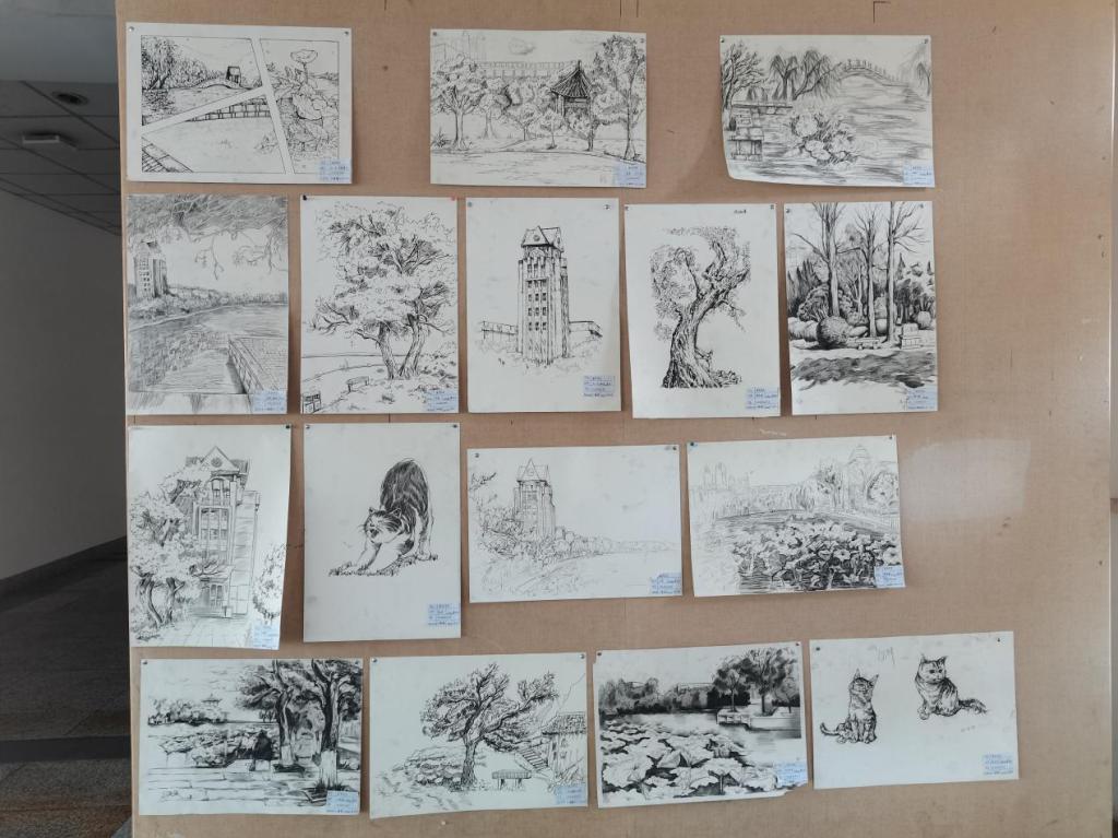 “风景速写:美的瞬间抓拍” 板块中,学生们携带画板,深入三元湖、八景园林、树荫道、教学楼角落,用快速、概括的线条捕捉校园的生动片段。秋日的翩翩落叶、午后的惬意角落、暮色里的建筑剪影……这些作品不仅记录了空间的物理形态,更透露出年轻学子对学习生活环境的敏锐观察与情感投射,展现了在动态中捕捉本质的造型能力,也为未来的作品创作注入灵感。